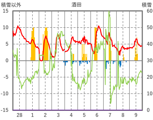 | 日 | 時 | 気温 | 降水 | 風向/風速 | 日照 | 積雪 | 降雪 |