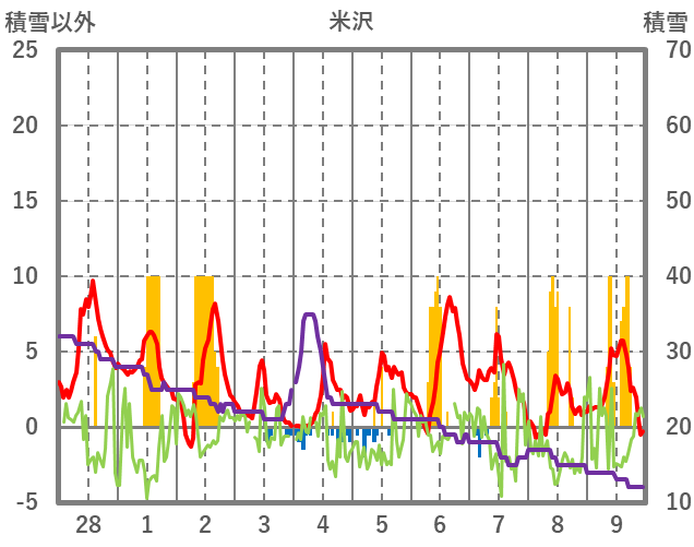| 日 | 時 | 気温 | 降水 | 風向/風速 | 日照 | 積雪 | 降雪 |