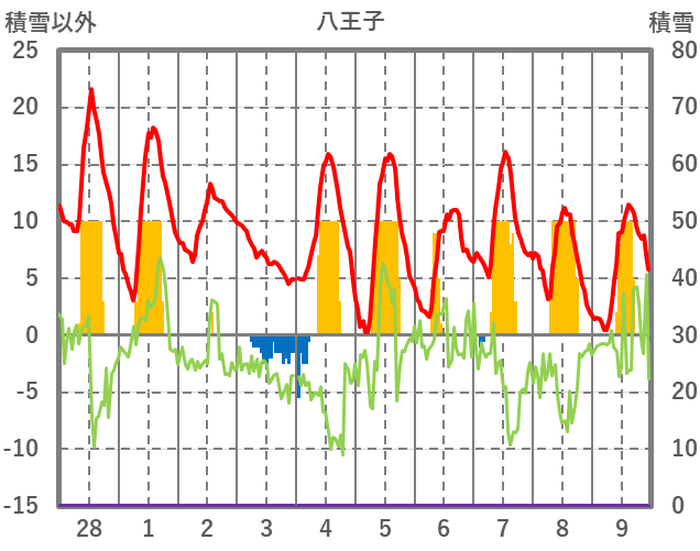 | 日 | 時 | 気温 | 降水 | 風向/風速 | 日照 | 積雪 | 降雪 |