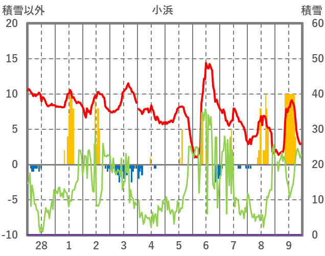 | 日 | 時 | 気温 | 降水 | 風向/風速 | 日照 | 積雪 | 降雪 |