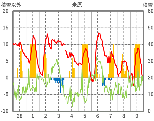 | 日 | 時 | 気温 | 降水 | 風向/風速 | 日照 | 積雪 | 降雪 |