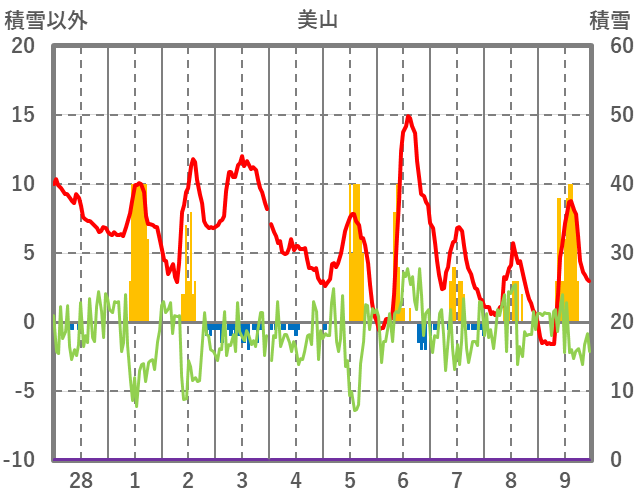 | 日 | 時 | 気温 | 降水 | 風向/風速 | 日照 | 積雪 | 降雪 |