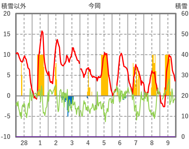| 日 | 時 | 気温 | 降水 | 風向/風速 | 日照 | 積雪 | 降雪 |