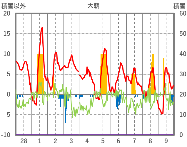 | 日 | 時 | 気温 | 降水 | 風向/風速 | 日照 | 積雪 | 降雪 |