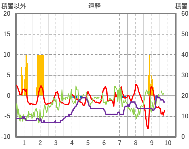 | 日 | 時 | 気温 | 降水 | 風向/風速 | 日照 | 積雪 | 降雪 |