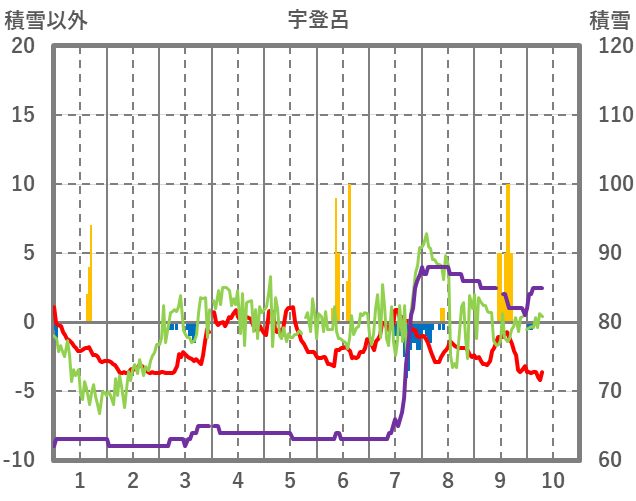 | 日 | 時 | 気温 | 降水 | 風向/風速 | 日照 | 積雪 | 降雪 |
