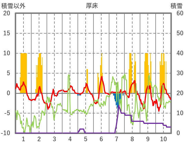 | 日 | 時 | 気温 | 降水 | 風向/風速 | 日照 | 積雪 | 降雪 |