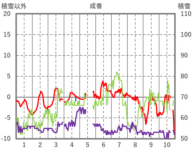 | 日 | 時 | 気温 | 降水 | 風向/風速 | 日照 | 積雪 | 降雪 |