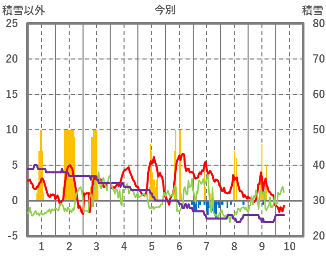 | 日 | 時 | 気温 | 降水 | 風向/風速 | 日照 | 積雪 | 降雪 |