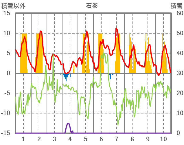 | 日 | 時 | 気温 | 降水 | 風向/風速 | 日照 | 積雪 | 降雪 |