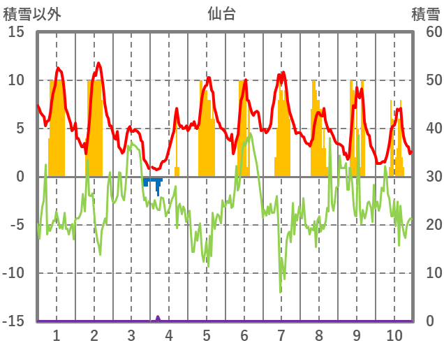 | 日 | 時 | 気温 | 降水 | 風向/風速 | 日照 | 積雪 | 降雪 |