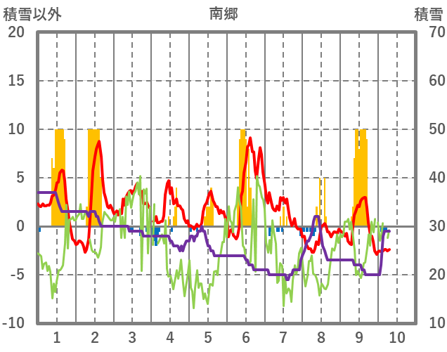| 日 | 時 | 気温 | 降水 | 風向/風速 | 日照 | 積雪 | 降雪 |