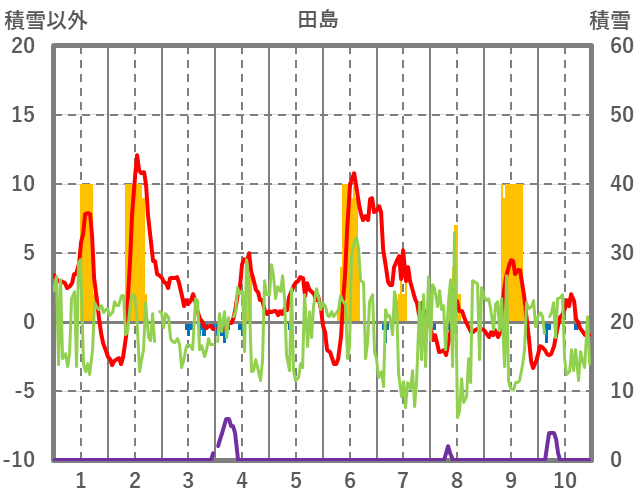 | 日 | 時 | 気温 | 降水 | 風向/風速 | 日照 | 積雪 | 降雪 |