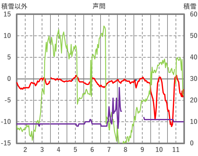 | 日 | 時 | 気温 | 降水 | 風向/風速 | 日照 | 積雪 | 降雪 |