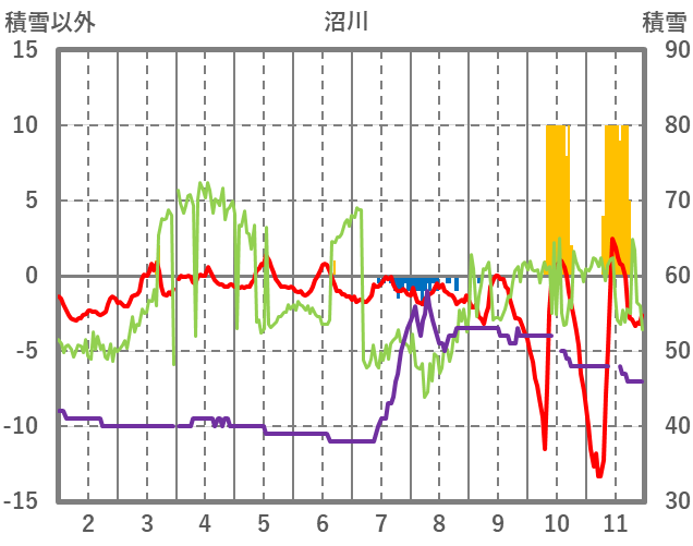 | 日 | 時 | 気温 | 降水 | 風向/風速 | 日照 | 積雪 | 降雪 |