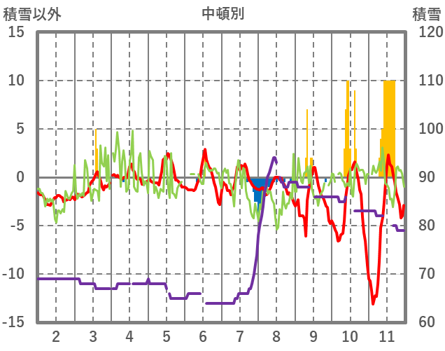 | 日 | 時 | 気温 | 降水 | 風向/風速 | 日照 | 積雪 | 降雪 |