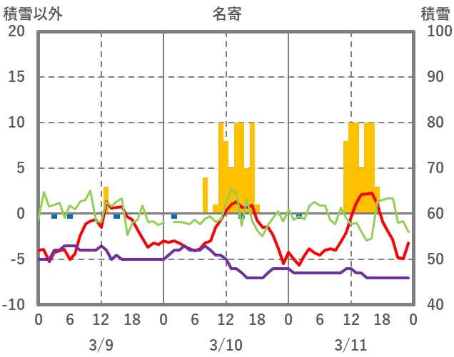 | 日 | 時 | 気温 | 降水 | 風向/風速 | 日照 | 積雪 | 降雪 |