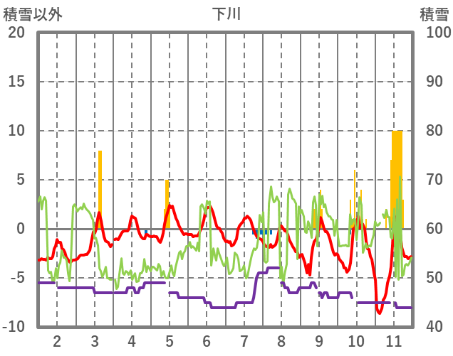 | 日 | 時 | 気温 | 降水 | 風向/風速 | 日照 | 積雪 | 降雪 |