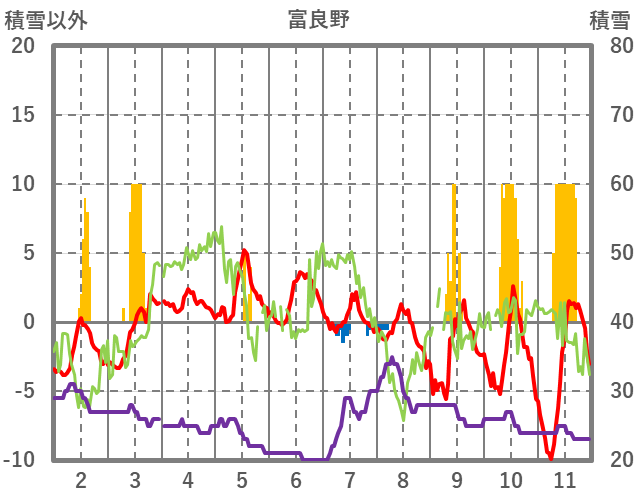 | 日 | 時 | 気温 | 降水 | 風向/風速 | 日照 | 積雪 | 降雪 |