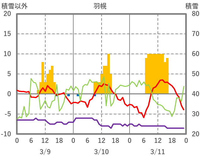 | 日 | 時 | 気温 | 降水 | 風向/風速 | 日照 | 積雪 | 降雪 |