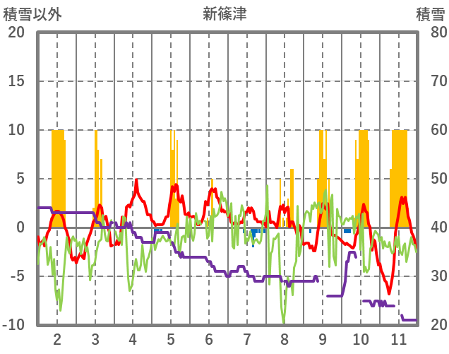 | 日 | 時 | 気温 | 降水 | 風向/風速 | 日照 | 積雪 | 降雪 |