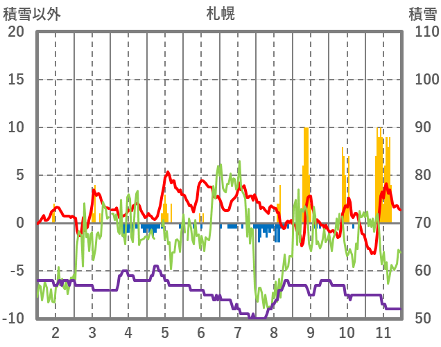 | 日 | 時 | 気温 | 降水 | 風向/風速 | 日照 | 積雪 | 降雪 |