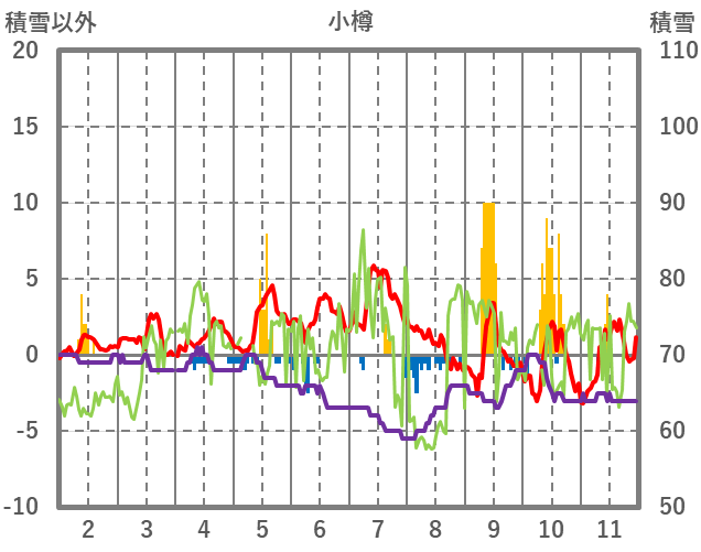 | 日 | 時 | 気温 | 降水 | 風向/風速 | 日照 | 積雪 | 降雪 |