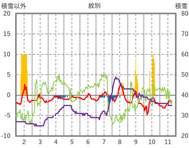| 日 | 時 | 気温 | 降水 | 風向/風速 | 日照 | 積雪 | 降雪 |