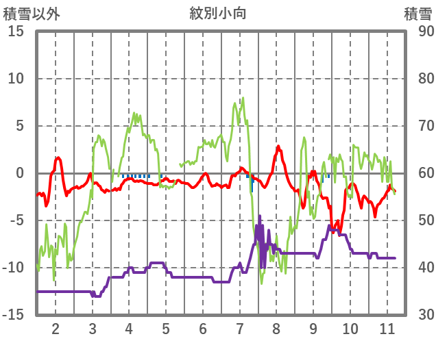| 日 | 時 | 気温 | 降水 | 風向/風速 | 日照 | 積雪 | 降雪 |