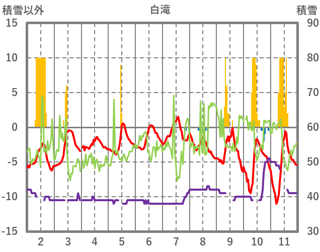 | 日 | 時 | 気温 | 降水 | 風向/風速 | 日照 | 積雪 | 降雪 |