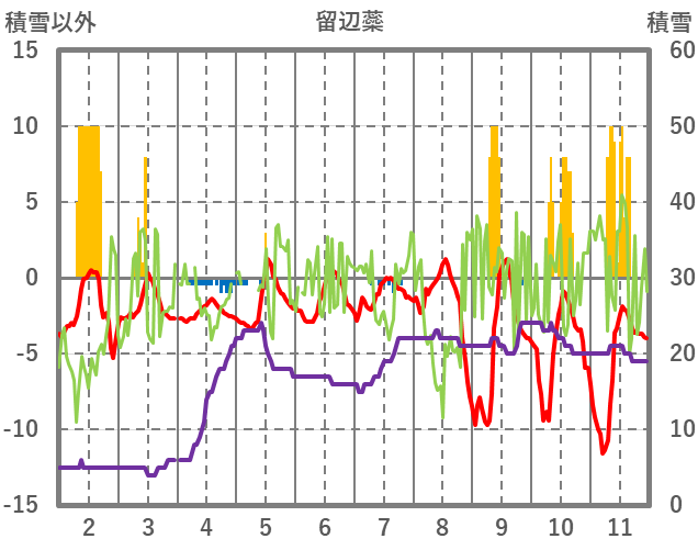 | 日 | 時 | 気温 | 降水 | 風向/風速 | 日照 | 積雪 | 降雪 |