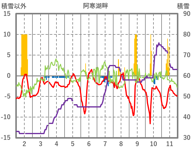 | 日 | 時 | 気温 | 降水 | 風向/風速 | 日照 | 積雪 | 降雪 |