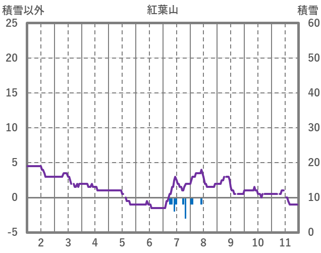 | 日 | 時 | 気温 | 降水 | 風向/風速 | 日照 | 積雪 | 降雪 |