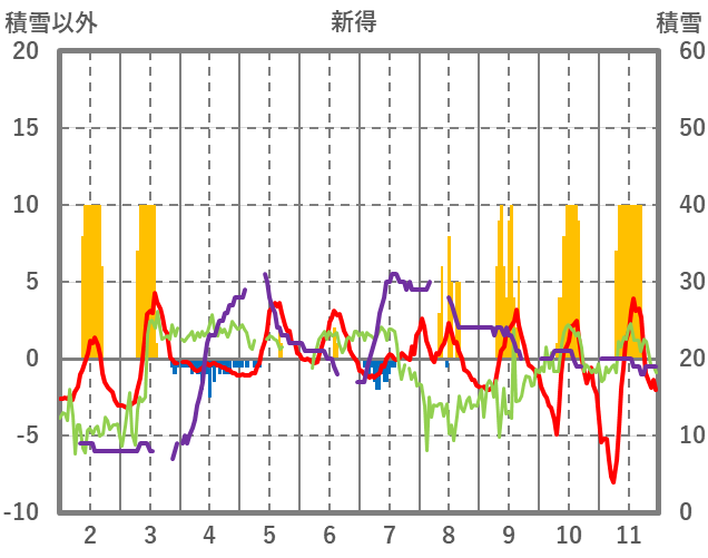 | 日 | 時 | 気温 | 降水 | 風向/風速 | 日照 | 積雪 | 降雪 |