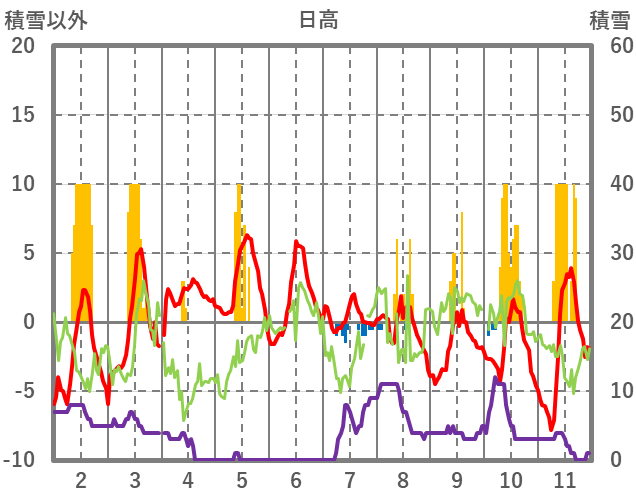 | 日 | 時 | 気温 | 降水 | 風向/風速 | 日照 | 積雪 | 降雪 |