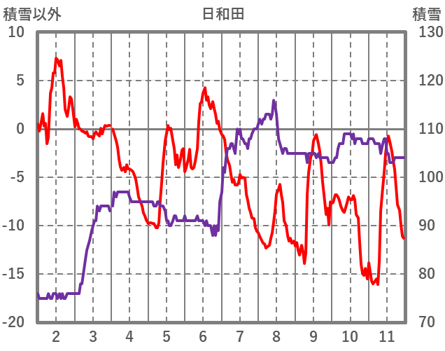 | 日 | 時 | 気温 | 降水 | 風向/風速 | 日照 | 積雪 | 降雪 |
