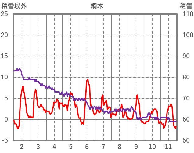 | 日 | 時 | 気温 | 降水 | 風向/風速 | 日照 | 積雪 | 降雪 |