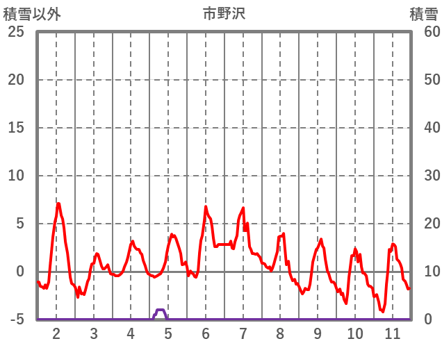 | 日 | 時 | 気温 | 降水 | 風向/風速 | 日照 | 積雪 | 降雪 |