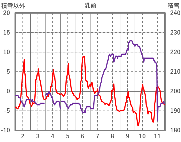 | 日 | 時 | 気温 | 降水 | 風向/風速 | 日照 | 積雪 | 降雪 |