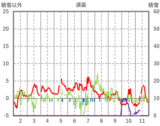 | 日 | 時 | 気温 | 降水 | 風向/風速 | 日照 | 積雪 | 降雪 |