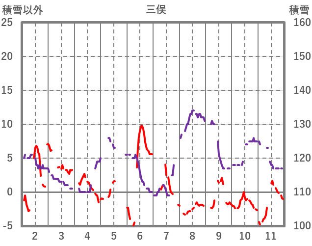 | 日 | 時 | 気温 | 降水 | 風向/風速 | 日照 | 積雪 | 降雪 |