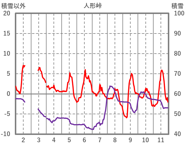 | 日 | 時 | 気温 | 降水 | 風向/風速 | 日照 | 積雪 | 降雪 |