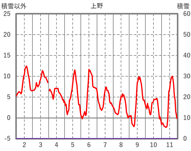 | 日 | 時 | 気温 | 降水 | 風向/風速 | 日照 | 積雪 | 降雪 |