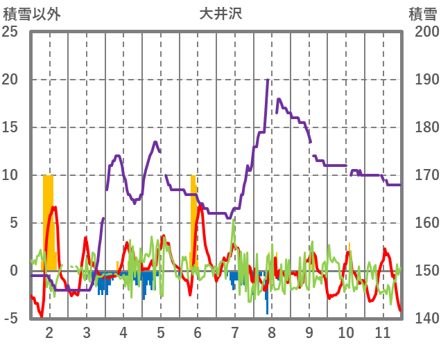 | 日 | 時 | 気温 | 降水 | 風向/風速 | 日照 | 積雪 | 降雪 |