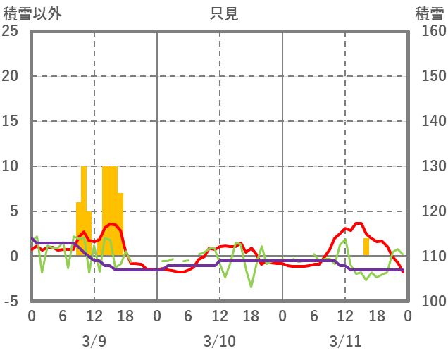 | 日 | 時 | 気温 | 降水 | 風向/風速 | 日照 | 積雪 | 降雪 |