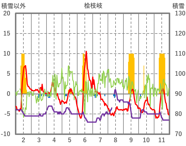 | 日 | 時 | 気温 | 降水 | 風向/風速 | 日照 | 積雪 | 降雪 |