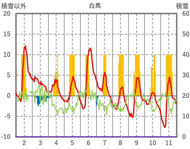 | 日 | 時 | 気温 | 降水 | 風向/風速 | 日照 | 積雪 | 降雪 |
