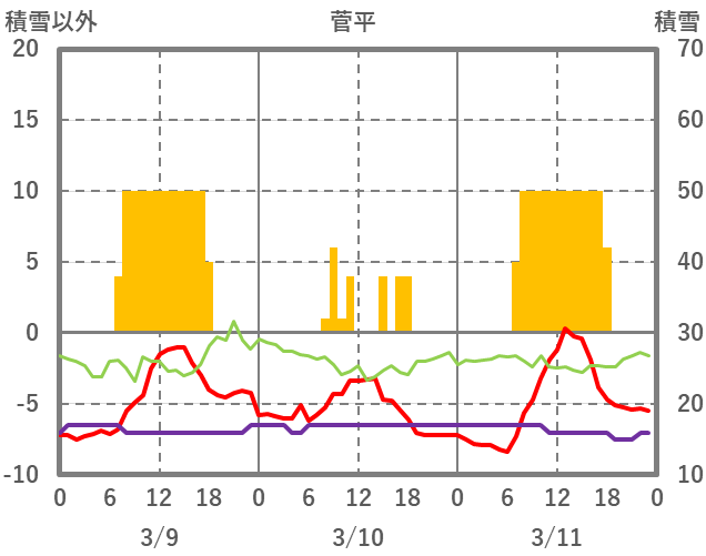 | 日 | 時 | 気温 | 降水 | 風向/風速 | 日照 | 積雪 | 降雪 |