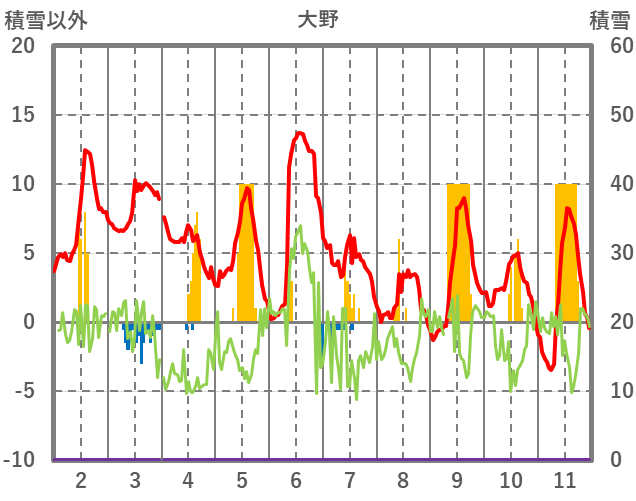 | 日 | 時 | 気温 | 降水 | 風向/風速 | 日照 | 積雪 | 降雪 |