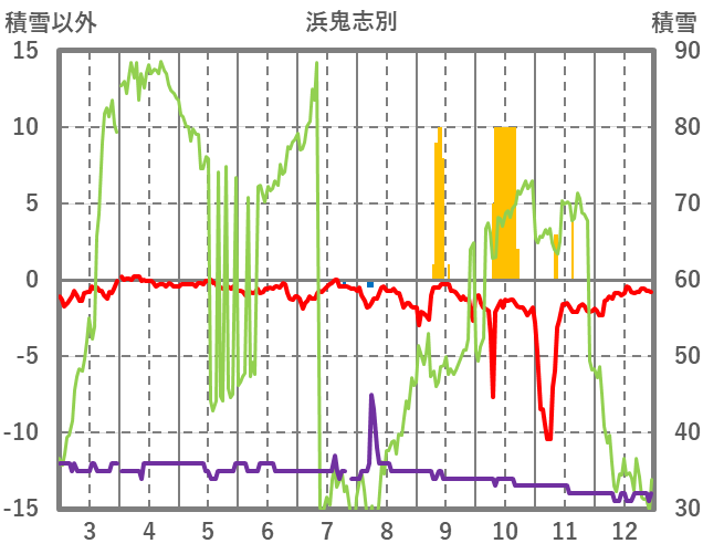 | 日 | 時 | 気温 | 降水 | 風向/風速 | 日照 | 積雪 | 降雪 |